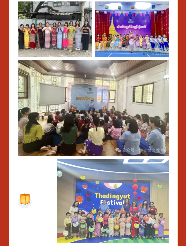 ÃåµéµÄÅ©ÀúÆßÔ£¨¹«Àú¾ÅÖÁʮԣ©£¬ÓÀ´ÁËÒ»ÄêÒ»¶ÈµÄÖ±Ÿû×äµãµÆ½Ú£¨Thadingyut Festival£©¡£´Ë¼Ñ½ÚÔÚÃåµéµÄÖØÒª³Ì¶È½ö´ÎÓÚÆÃË®½Ú£¬¿°³ÆÃåµéµÄÒ»¸öÖØ´ó½ÚÈÕ¡£µ±µãµÆ½ÚÀ´ÁÙÖ®¼Ê£¬±ãÒâζ×ÅÃåµéµÄÓê¼¾¼´½«»ÉϾäºÅ¡£ Ïà´«ÊÍåÈIJÄá·ð×æÎªÁ˱¨´ðĸÇ׵Ķ÷Ç飬ÓÚÍßËó£¨ÃåÀúËÄÔ£©ÔÂÔ²ÈÕǰÍùâáÀûÌ죬ÔÚÄÇÀï½áÏݲ¾ÓÈý¸öÔ²¢ÏòÆäĸÇס¢ÉñÏɺÍèóÌì½²Ëа¢Åþ´ïĦ·¨£¬È»ºóÓÚÖ±Ÿû×䣨ÃåÀúÆßÔ£©ÔÂÔ²ÈÕ·µ»ØÈ˼䡣ÓÚÊÇÐÅÖÚ¾ÍÔÚµ±ÈÕÕŵƽá²Ê£¬È¼µãµÆÖòÓ½Ó·ðÍÓ½µÁÙ£¬Õâ¾ÍÊÇÖ±Ÿû×äµãµÆ½ÚµÄÓÉÀ´¡£½ìʱ£¬ÃåµéÈ«¹ú¸÷µØµÄ·¿ÎÝÓ뽨Öþ½Ô»á±»²ÊµÆÓëÖ½µÆÁý×°µãµÃèè²¶áÄ¿£¬À¯ÖòÒ²·×·×±»µãÁÁ¡£»¹»áÔÚ½ÚÈÕÀï¾ÙÐÐËо°Ý·ð¡¢Ï×»¨¹©Ê³¡¢²¼Ê©ÖÚÉúµÈ»î¶¯¡£ ÔÚÃåµé£¬µãµÆ½ÚÒàÊǾ´ÀϽڣ¬ÊǸж÷³¤ÕßµÄÖØÒªÈÕ×Ó¡£µ±Ì죬ÈËÃÇ»áÂ¡ÖØ¾ÙÐо´Àϻ¡£ÎÞÂÛ´ÓʺÎÖÖÖ°Òµ£¬ÎÞÂÛ¹ÙÖ°¸ßµÍ¡¢ÄêÁä´óС£¬Ò²ÎÞÂÛÉú»îÔÚ³ÇÊл¹ÊÇÏç´å£¬ÈËÃǶ¼»áÔÚÕâÒ»ÌìÒÔם֨ÇÒÕýʽµÄ·½Ê½Ïò¸¸Ä¸¡¢ÀÏʦ¼°³¤±²Ðйò°ÝÀñ£¬Ìýȡѵ½ë£¬ÇëÇóËûÃÇ¿íË¡¹ý´í¡£ ΪºëÑïÓë´«³ÐÎÒÃÇÃåµéµÄ´«Í³ÎÄ»¯£¬Èú¢×ÓÃǸüºÃµØÁìÂÔ´«Í³ÎÄ»¯µÄ÷ÈÁ¦£¬ÉîÇÐÌåÑ鴫ͳÎÄ»¯µÄ¶ÀÌØÔÏ棬ÔöÇ¿ËûÃǶԴ«Í³ÎÄ»¯µÄÈÏͬ¸ÐÓë×ÔºÀ¸Ð¡£²©ÎÄÑ§Ð£ÌØÒâ¾Ù°ì ¡°Ö±Ÿû×äµãµÆ½Ú¡± »î¶¯£¬¹§Çë´óºÍÉÐǰÀ´Îªº¢×ÓÃÇÄî¾Æí¸££¬ÆÚÍûº¢×ÓÃÇÄÜÔÚם֨µÄÒÇʽÖиÐÎò´«Í³ÎÄ»¯µÄÉîºñÄÚºÓëÉñÊ¥ÒâÒå¡£´ËÍ⣬ѧУ»¹¾ÙÐÐÁ˰ÝʦÀñ£¬Ã»ÓÐÉÝ»ªµÄÀñÎ½ö½öÊÇÓÉÀÏʦ´øÁìѧÉúÏòѧУ×ÊÉîÀϽÌʦ°Ýл¡£ÒÔʵ¼ÊÐж¯Îªº¢×ÓÃÇ×ö³ö±íÂÊ£¬ÓÃÐж¯½Ì»áº¢×Ӹж÷¡£ Ö±Ÿû×äµãµÆ½Ú³ä·ÖÌåÏÖÁËÎÒÃÇÃåµéÈ˶Ô×ڽ̵Äò¯³Ï£¬ÉÆÁ¼¿¶¿®µÄÄÚÐĺͶԳ¤Õß¹§¾´ÓÐÀñµÄ´«Í³ÎÄ»¯¡£